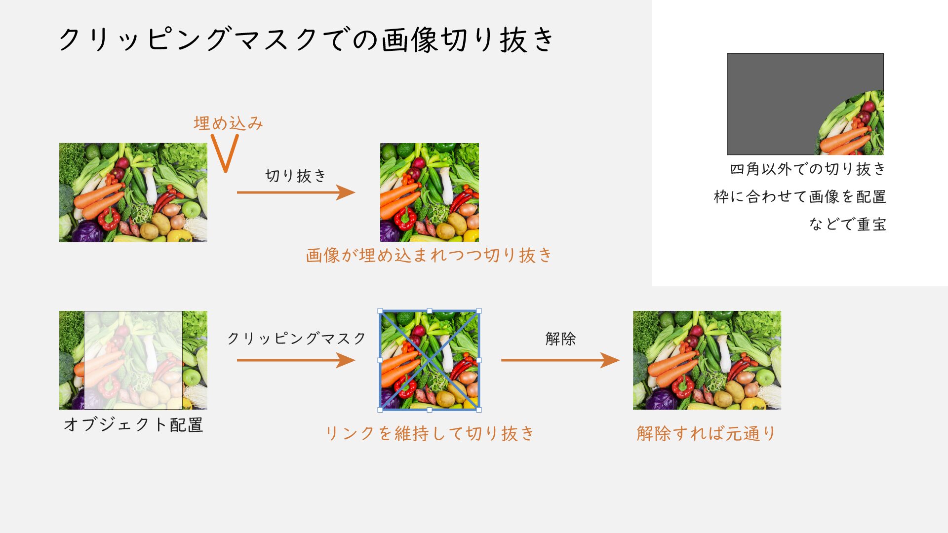 通常の切り抜き以外にも、四角形以外の形で切り抜いたり、デザインの枠に合わせて配置したい時などに重宝する機能です。
