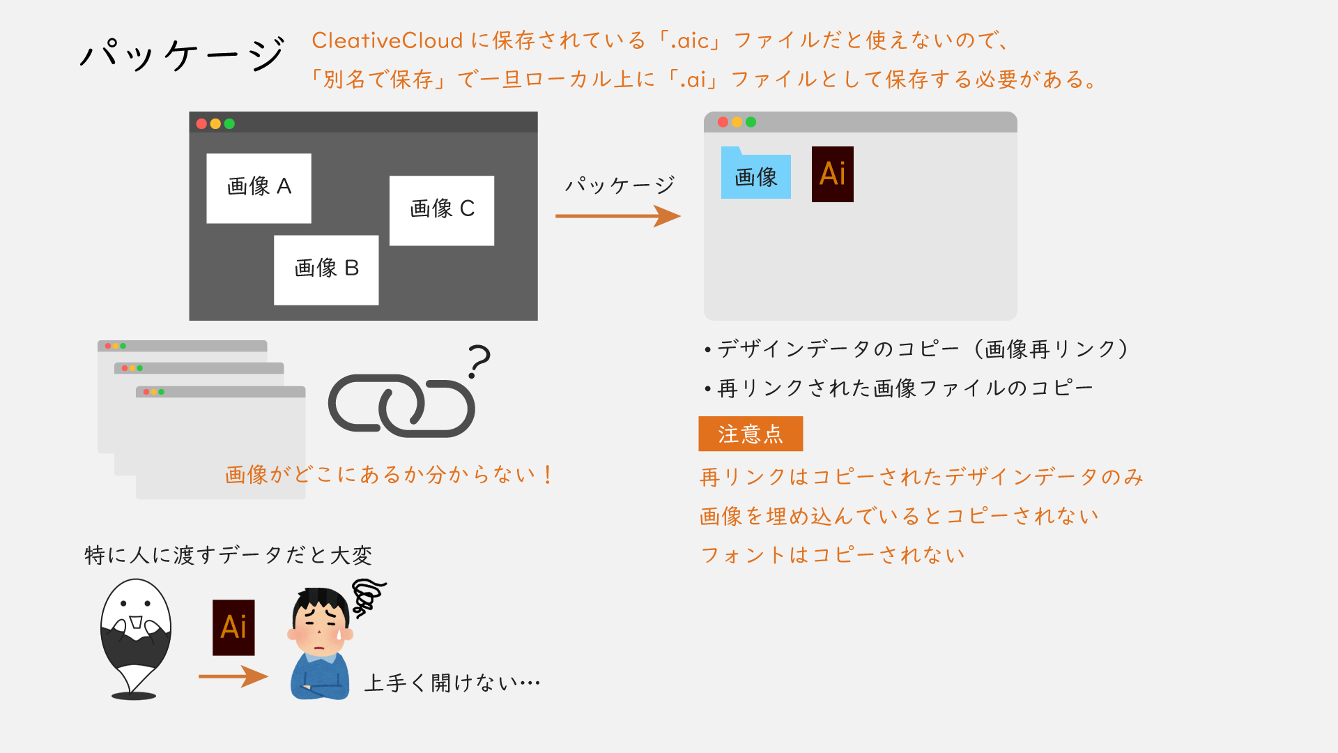 画像をたくさん使うデザインや、案件の納品時に活躍するイラレの機能「パッケージ」について解説します。