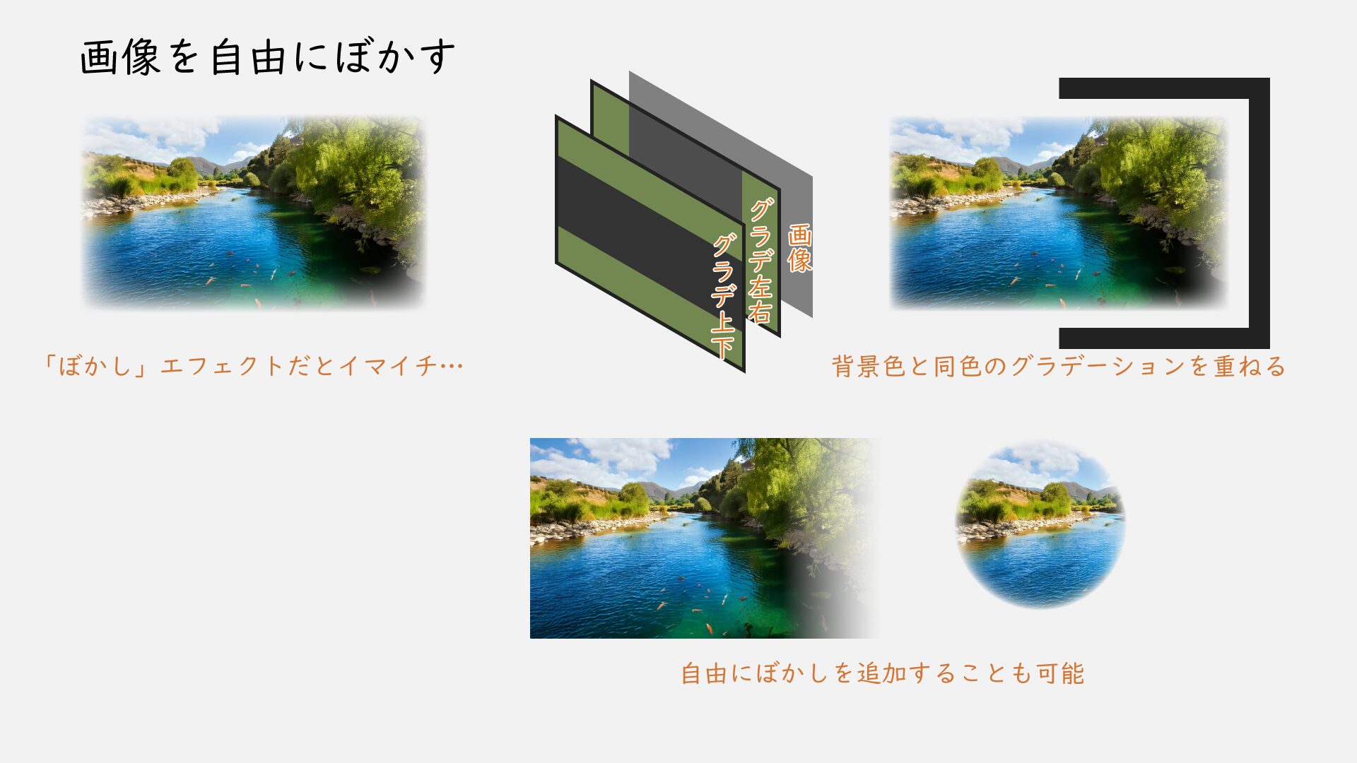背景が画像やグラデーションの場合は出来ないという制限はありますが、右だけとか、円形とか自由自在にぼかすことが出来るので、一つの方法として覚えておくと良いでしょう。