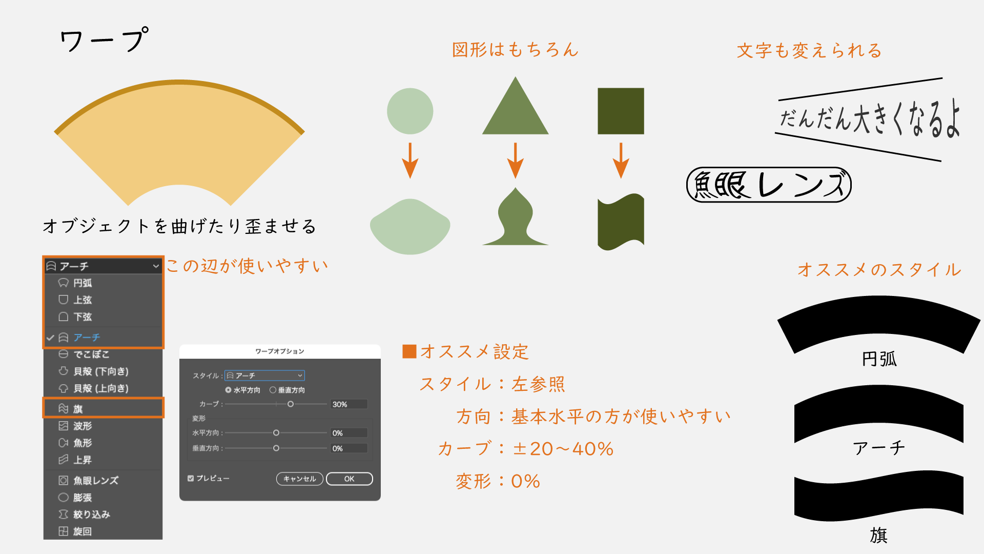 スタイルは「円弧」「アーチ」「旗」辺りがおすすめ、「上弦」「下弦」もシンプルな変形で使いやすいです。