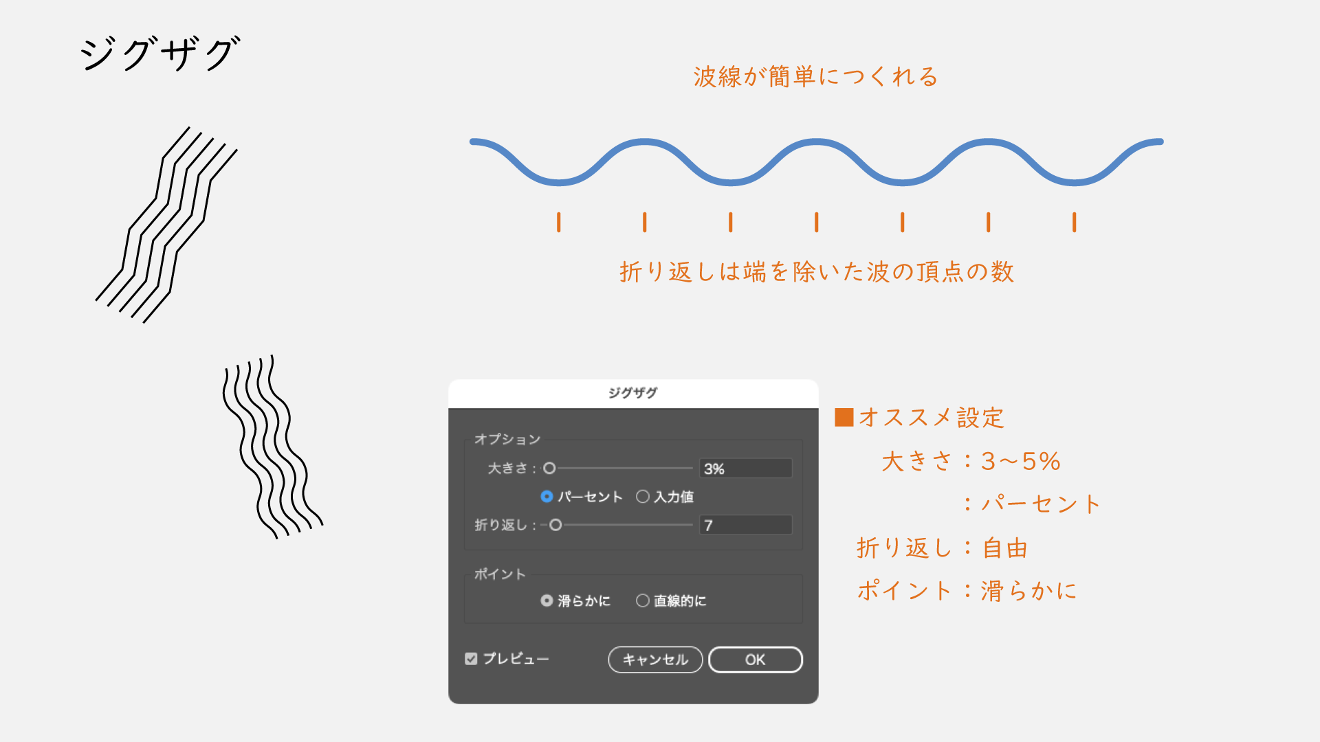 「大きさ」は線のサイズに左右されにくい「パーセント」で3〜5%で自然な波になります。