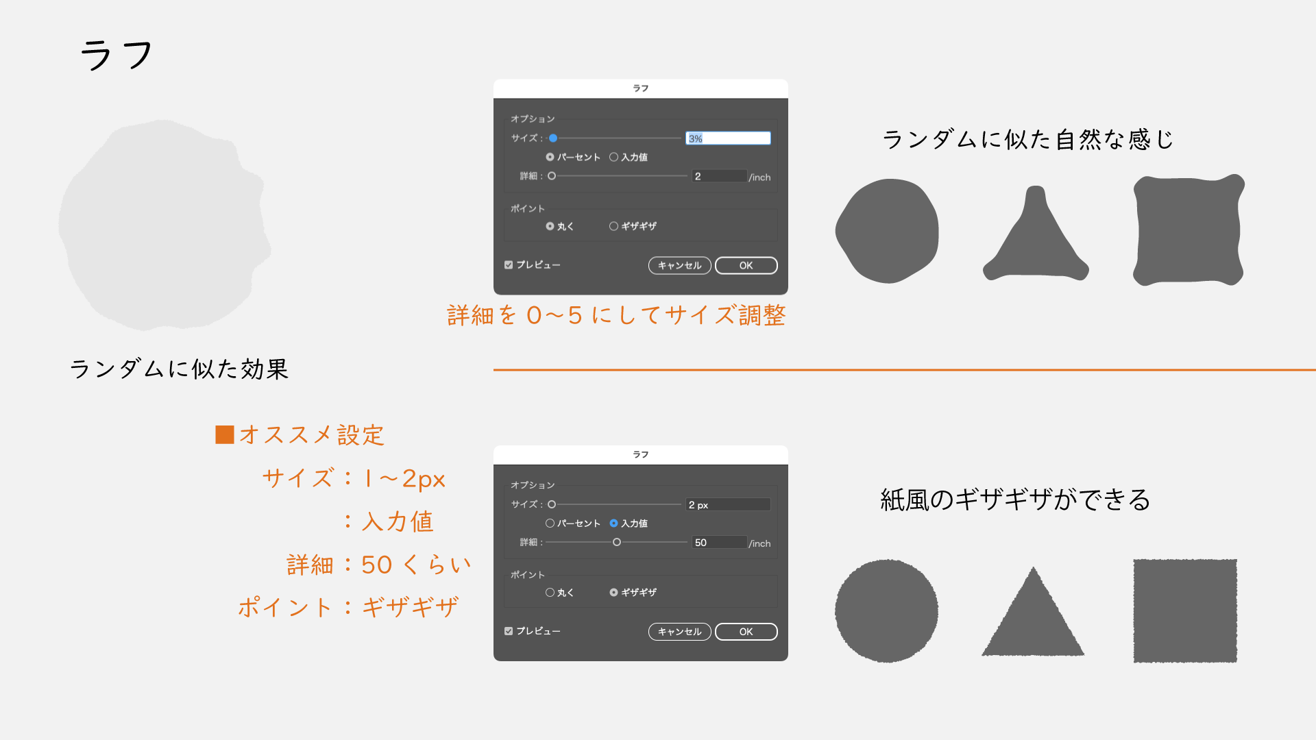 「ポイント:ギザギザ」にして「サイズ:入力値」で1〜2px、「詳細:50」くらい多めにしてください。