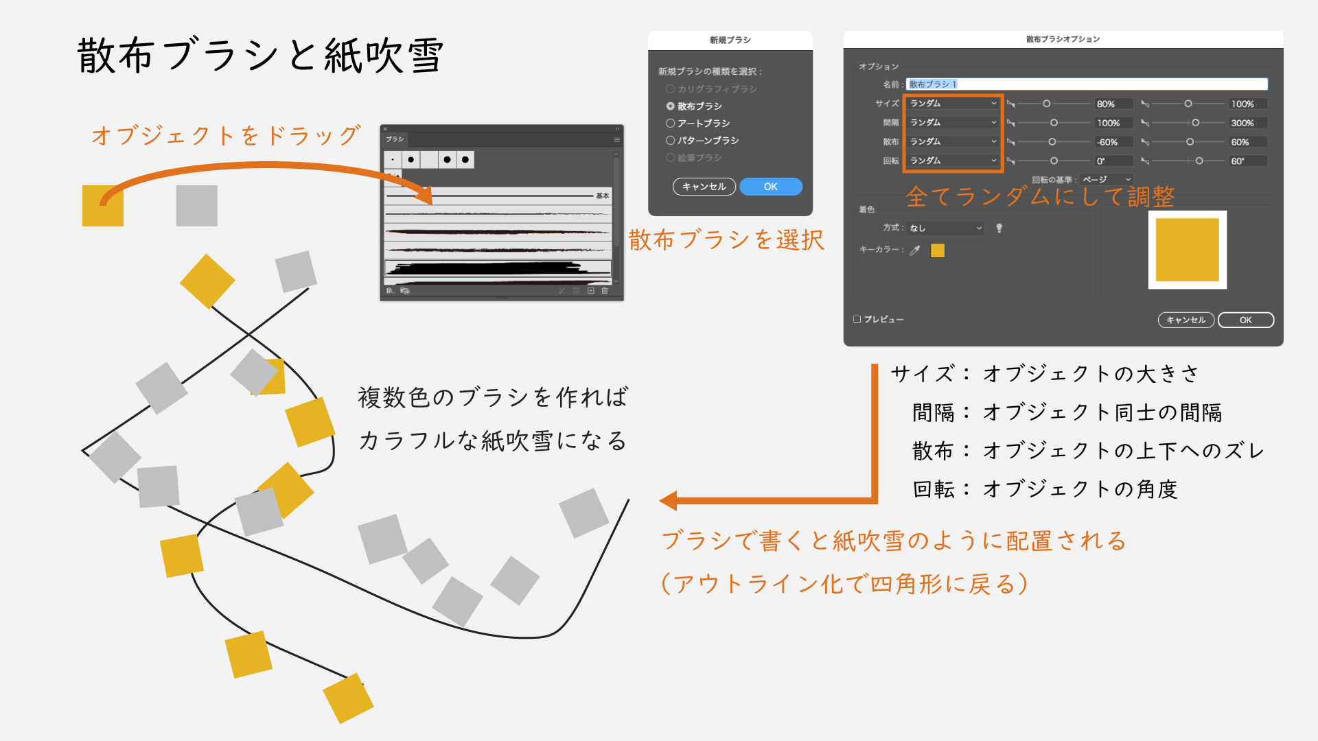 「ランダム」の場合、配置した線を選択して登録したブラシをクリックすれば毎回違う紙吹雪になるので、ある程度設定したら気に入る配置になるまで連打すればOK。